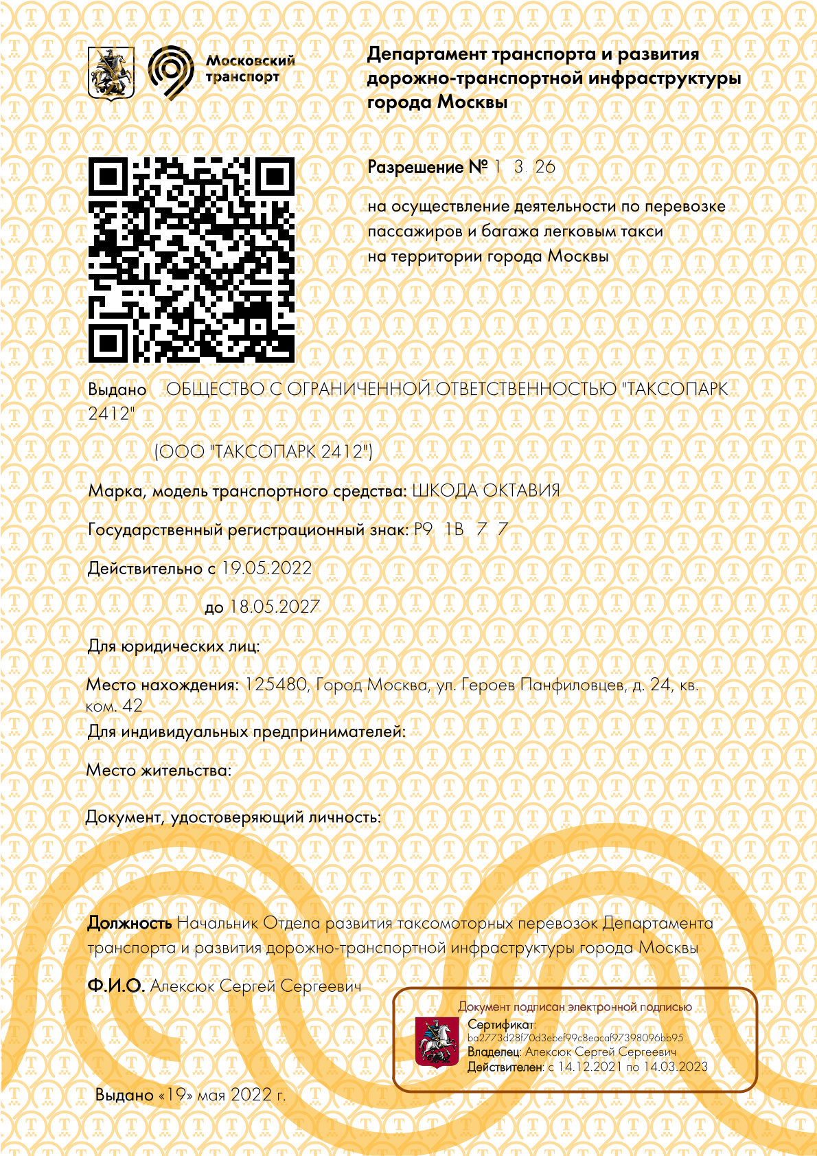 С 01 сентября 2023 года все ранее выданные Департаментом транспорта г. Москвы разрешения на осуществления деятельности по перевозке пассажиров легковым такси были автоматически переоформлены в реестровые записи в реестре легковых такси, а данные о перевозчике были перенесены в реестр перевозчиков. Фактически старые бумажные разрешения не утратили право владельца на перевозку в качестве такси, а были перенесены в два новых реестра с сохранением установленного ранее периода своего действия. Бумажный вариант старого разрешения был заменен двумя номерами записи в реестрах и стал необязательным для предъявления.